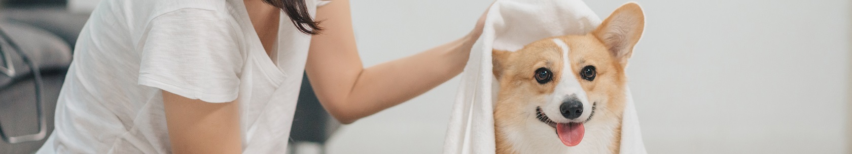 เมื่ออาบน้ำเสร็จสิ้น ให้เช็ดตัวสัตว์เลี้ยงด้วยผ้าขนหนูที่แห้งสะอาด และอาจใช้ไดร์เป่าผมช่วยในการเป่าขนของพวกเค้าให้แห้งสนิท แต่ต้องระวังให้เลือกใช้ในโหมดลมแรงต่ำ ไม่ใช้ลมร้อน และเว้นระยะให้ห่างจากขนและผิวหนังของสัตว์เลี้ยงพอประมาณ คอยสังเกตบริเวณข้อพับต่างๆ หรือมุมอับต่างๆนั้นเเห้งดีหรือยัง เพื่อป้องกันปัญหาผิวหนังอักเสบ ติดเชื้อจากความอับชื้นได้